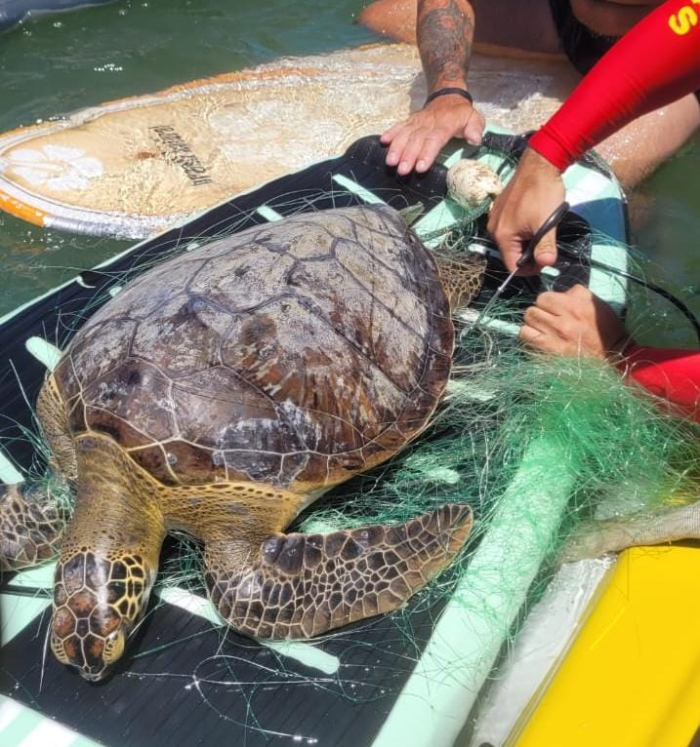 Os guarda-vidas, que estavam realizando ronda preventiva no mar, realizaram o deslocamento de jetski, liberaram a tartaruga da rede de pesca, mas ao devolvê-la ao mar perceberam que ela permaneceu inerte e afundou.