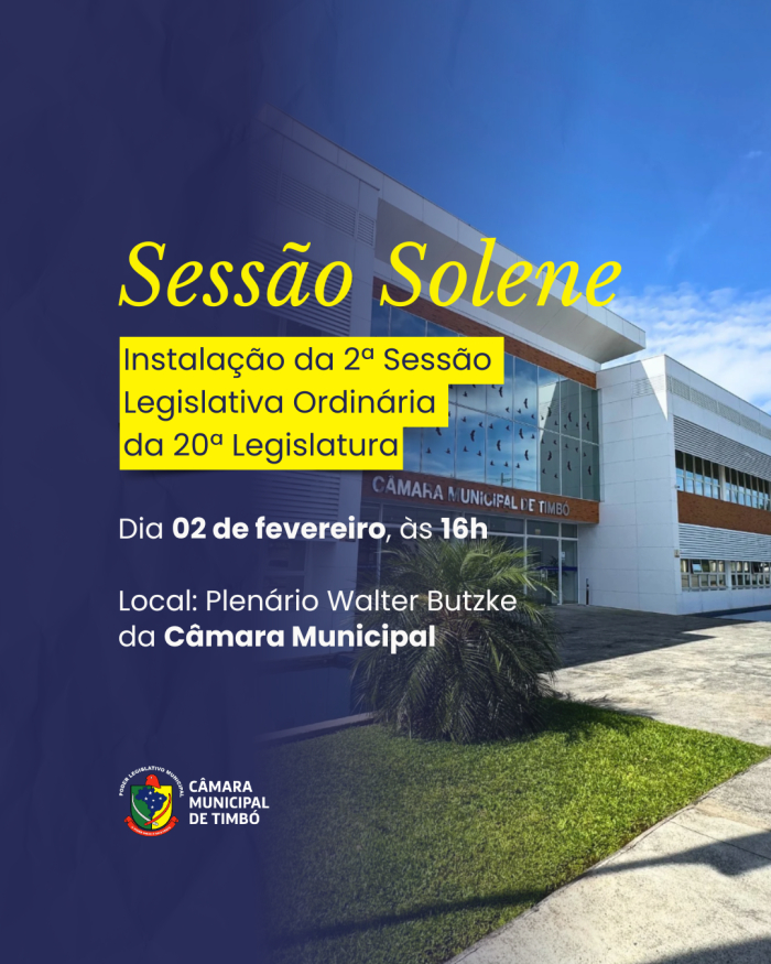 Na próxima segunda-feira, 02 de fevereiro, a Câmara de Timbó realiza a Sessão Solene de Instalação da 2ª Sessão Legislativa Ordinária da 20ª Legislatura. Ela marca o início oficial do segundo ano de trabalho dos vereadores.