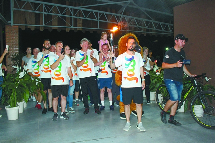 Durante 3,7 quilômetros passando pelas ruas do Centro, cerca de 100 atletas de várias idades se revezaram até chegar no Pavilhão de Eventos Henry Paul, local da abertura oficial da competição, na sexta-feira às 20h. Esse ano os jogos vão reunir 121 municípios, se igualando com a edição anterior, que foi recorde na história desde a implantação das fases micro e regional.