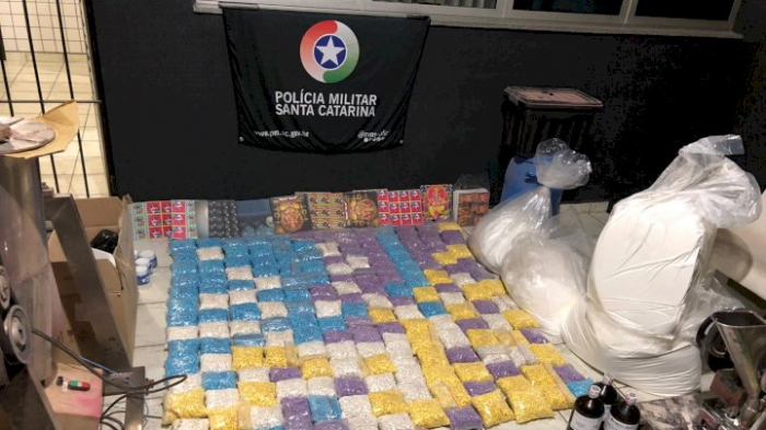 No local, foram apreendidos diversos equipamentos e insumos utilizados para a produção de drogas sintéticas, bem como 234 mil comprimidos de ecstasy, 66.520 micropontos de LSD e aproximadamente 48 quilos de MDMA, além de quatro munições calibre 38.