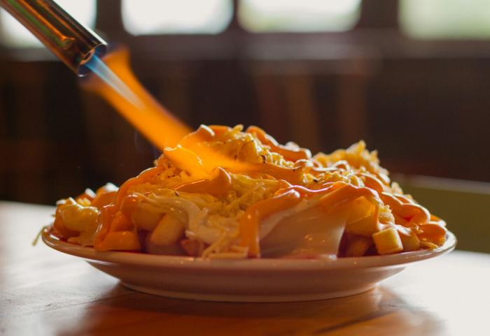 Um prato normal de batatas fritas com quatro queijos (cheddar, muçarela, queijo prato e catupiry) é servido à mesa, mas, logo em seguida, aquele se torna um pedido irresistível quando, com um maçarico, o atendente derrete todos os queijos ali, na hora, oferecendo um prato único aos visitantes.